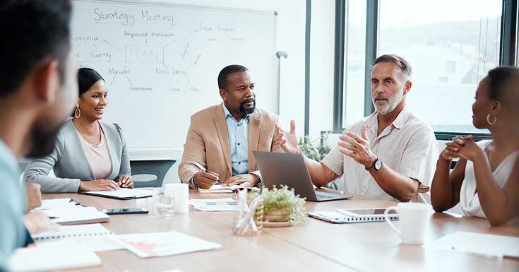Tim bisnis sedang mendiskusikan strategi change management dalam rapat, menunjukkan pentingnya komunikasi dan kolaborasi.